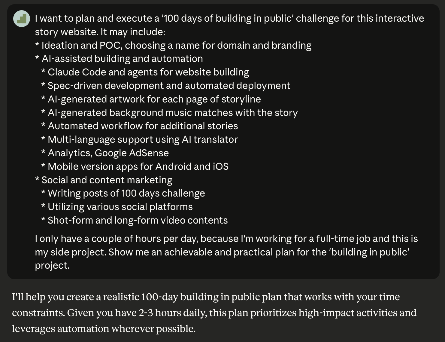 Anyway, Claude developed a 100-day “building in public” challenge plan considering these factors: