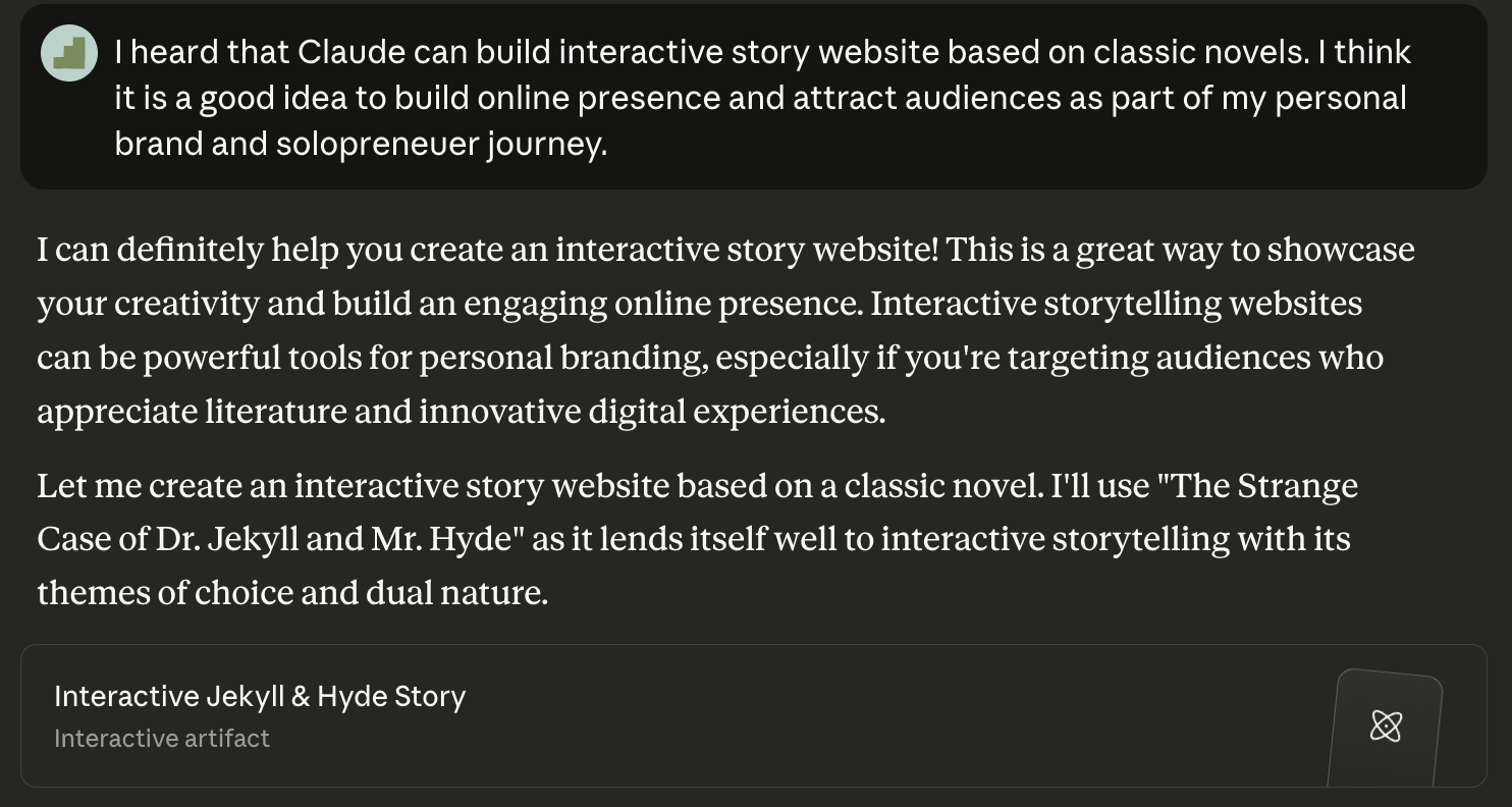 I immediately launched the Claude app, created a project called “Interactive Story Website for Classic Novels,” and explained the idea.