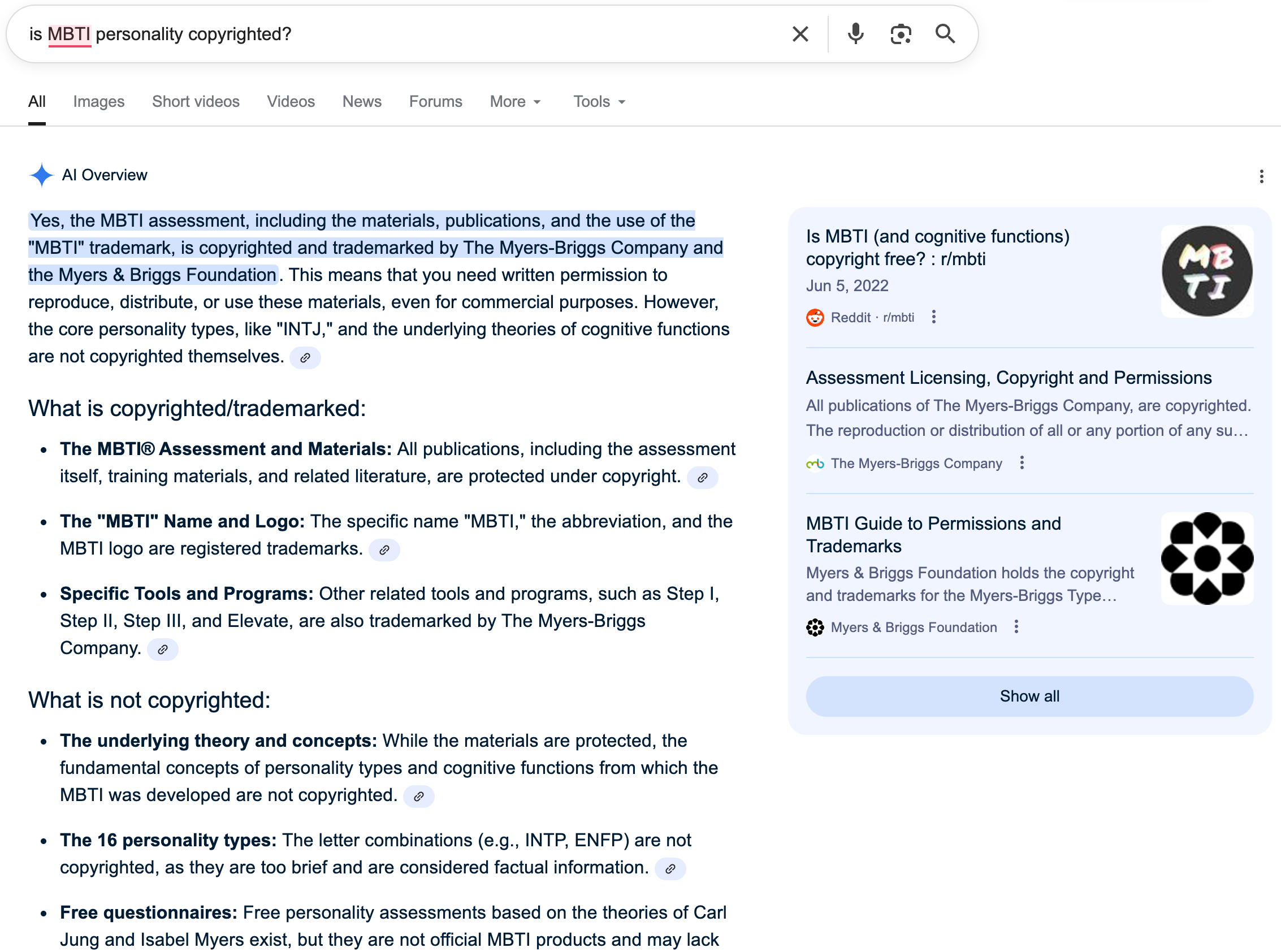 However, the 16 personality types and their abbreviations (INTP, ENFP, etc.) are not copyrighted and can be freely used by anyone.