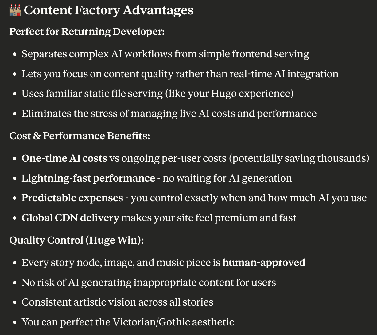 - Weeks 3-4: Core feature development, story content generation workflow, MVP launch with one demo content