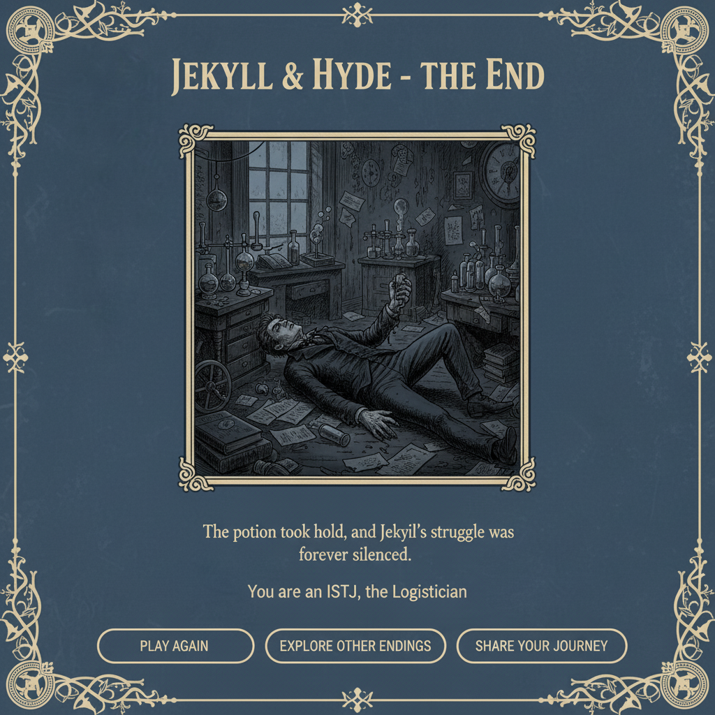 As shown in this example generated with Gemini Nano (banana model), we score MBTI traits based on user choices at each story branch and display their personality type on the ending screen.