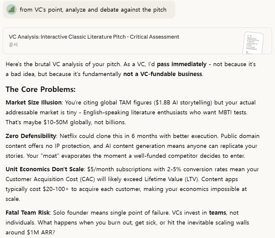 So I asked Claude to create an elevator pitch from a solo founder’s perspective, then review the idea and business model from a VC’s perspective.