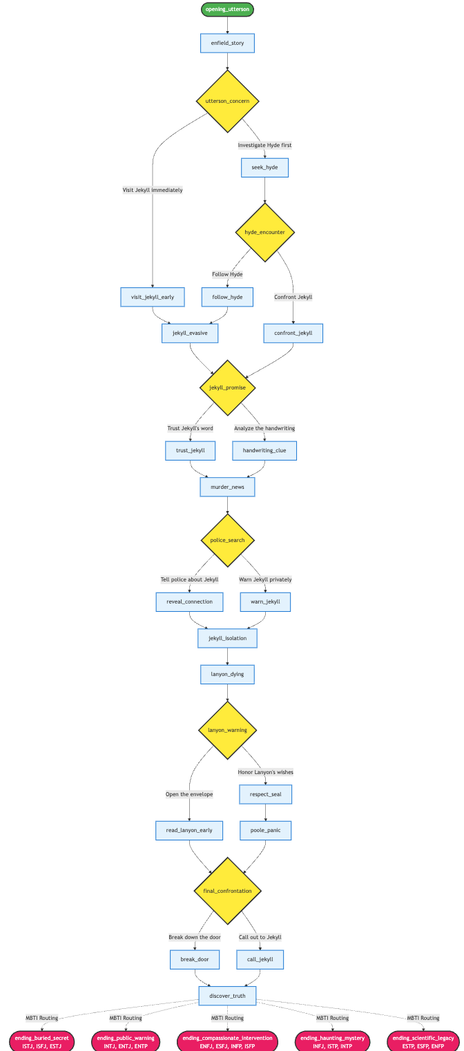 Here’s the flowchart of the Jekyll and Hyde story pack generated in the first test.